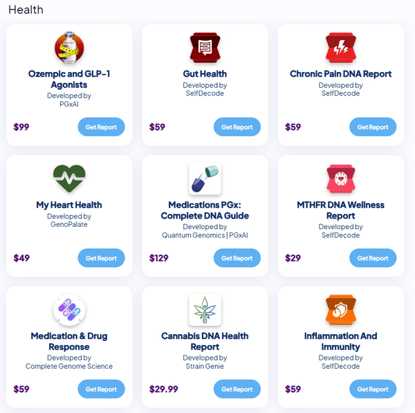 Ud over disse apps kan du købe tilvalg fra 59 $, såsom: Ozempic og GLP-1 Agonist, MTHFR DNA Wellness Report).